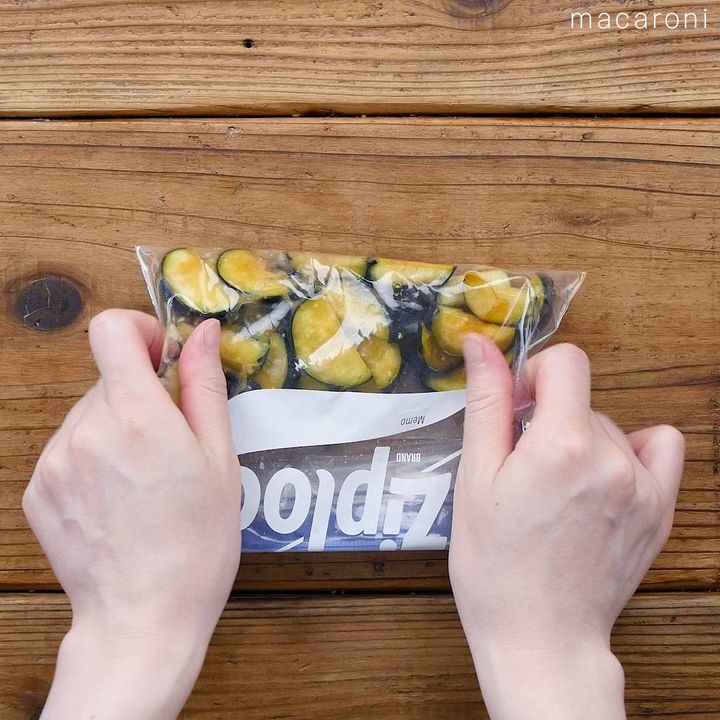 3: チャック付きのポリ袋に移し、しょうが、めんつゆを加えて混ぜます。10分ほどなじませたら完成です。
