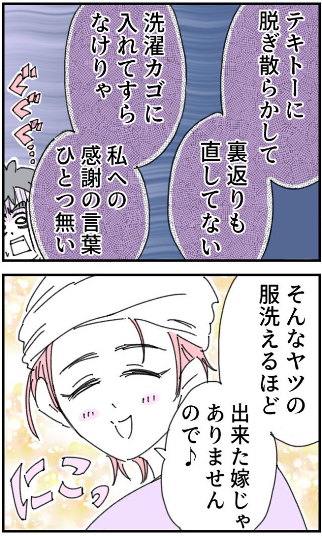 「テキトーに脱ぎ散らかして・・裏がえりも直してない。洗濯カゴに入れてすりゃなけりゃ、私への感謝の言葉もひとつも無い・・」かおりさんにそう言われて「ぐぐぐ・・・」と返す言葉もないいちろうさん、すると「そんなヤツの服洗えるほど、出来た嫁じゃありませんので!」にっこり笑顔のかおりさんがダメ押しのように言いました。