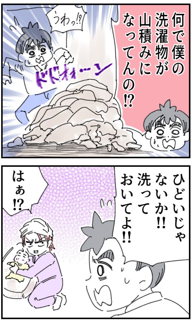 「な、何で僕の洗濯物が山積みになってんの!?」自分の部屋に大量に積み上げられた自分自身の洗濯物を見て驚くいちろうさんは「ひどいじゃないか!!洗っておいてよ!!」とかおりさんに訴えましたが「はぁ!?」と一喝されてしまいます。