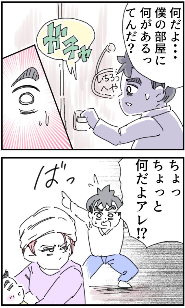 「こはるは私が見るからあなたは別の仕事をやってちょうだい」とかおりさんに言われたいちろうさん、大量の仕事が待ってるから、と自分自身の部屋に行ってみてと言われ、「何だよ・・僕の部屋に何があるってんだ?」そう思いながら部屋のドアを開けてビックリ!!すぐにかおりさんの所に戻り「ちょっ・・ちょっと何だよアレ!?」とたずねました。かおりさんはいちろうさんが慌てる姿を見て、静かに睨みつけました。