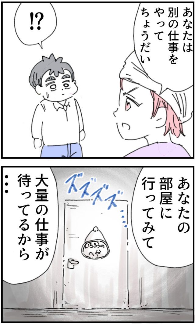 「あなたは別の仕事をやってちょうだい」突然かおりさんに別の仕事をしてと言われ驚くいちろうさん、すると「あなたの部屋に行ってみて、大量の仕事が待ってるから・・」自分自身の部屋に大量の仕事がある。そう言われたいちろうさんは、かおりさんに言われるまま自分の部屋に向かいました。
