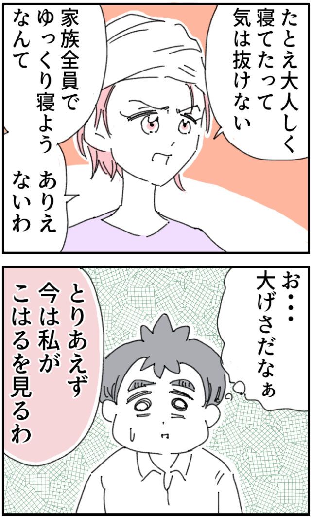 さらに続けて「たとえ大人しく寝てたって気は抜けない。家族全員でゆっくり寝ようなんてありえないわ」かおりさんがそう言うと、「お・・大げさだなぁ」といちろうさんは心の中で呟きました。そのまま「とりあえず今は私がこはるを見るわ」かおりさんの言葉が続きます。