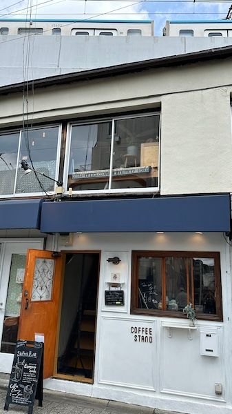 西荻窪駅南口を出て荻窪方面に線路沿いを歩くと、左手に2階建ての白い建物が見えてきます。ほのかに香ばしいコーヒーの香り。戸口には黒い看板と2階に上がる階段。目をひくロゴ。通りに面した窓を覗くと焙煎機が見えます。