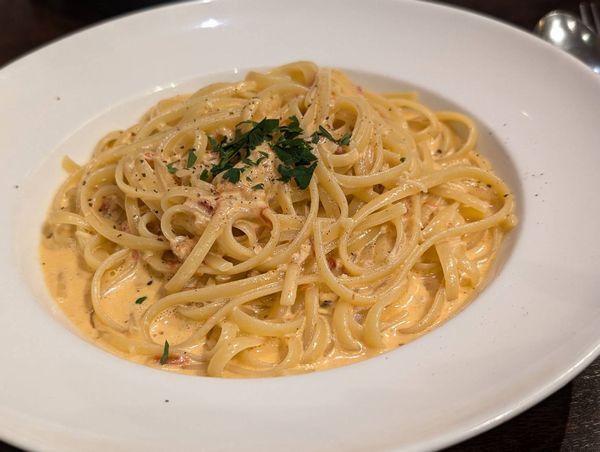 私が注文したのは大大大好きな、「渡りガニのトマトクリームソース」ですが、ニンニクがしっかりきいて、トマトクリームももったりとパスタに絡む濃厚さ!カニはほぐして和えてるタイプだったので、手も汚さずに楽しめました。