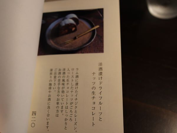 では、ドライフルーツとナッツの生チョコレートにしよう。それと深煎りのコーヒー。