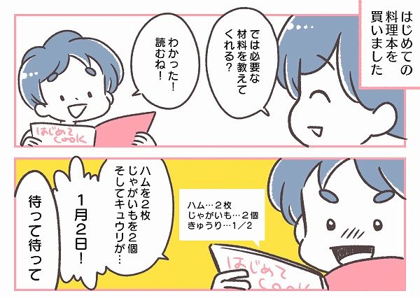 クラスメートに料理上手な子がいるそうです。休み時間に献立を考えていた姿がかっこよかったのでしょう、娘も料理ができるようになりたいと言い出しました。その熱意は、本屋で料理本をねだるほど。準備のために読み上げてもらったのですが、分数を習い始めた娘は、2分の1が読めずまさかの「1月2日」に。料理本でまた忘れられない思い出ができました(笑)