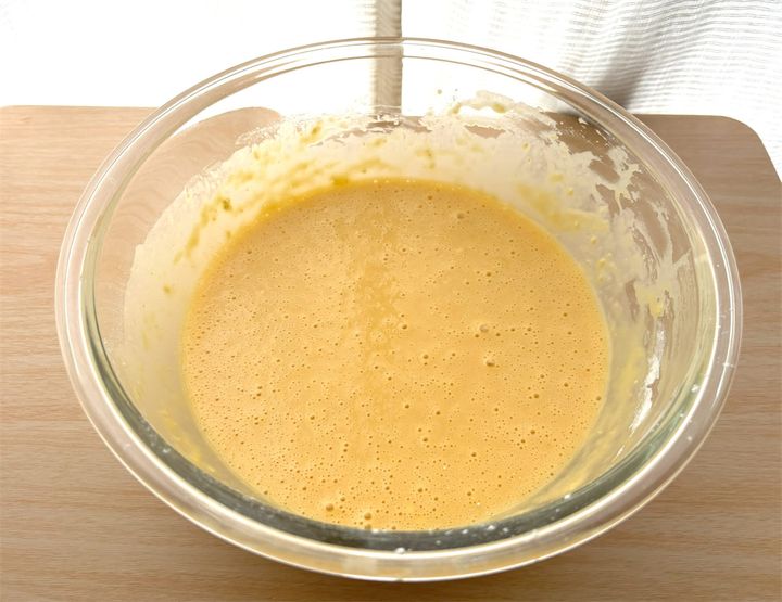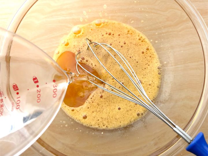 動画内では、左から右へ一直線になるように泡立て器を動かすと「だまにならずキレイに混ざる」と紹介されていました。