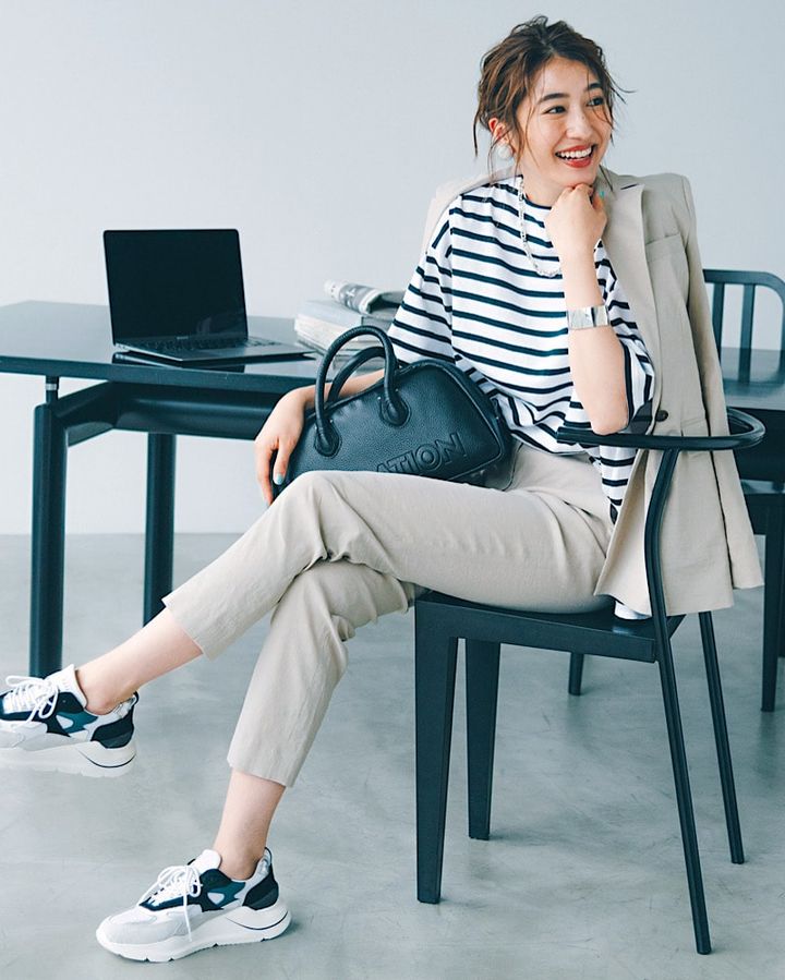 9月2日(金)、ベーシックなパンツスーツには、シンプルなインナーではなく、「ボーダーT」でラフさをプラスするのがおすすめ。スポーティなバッグとスニーカーでカジュアルダウンすれば、普段とはひと味違う、リラクシーな通勤スタイルが叶います。