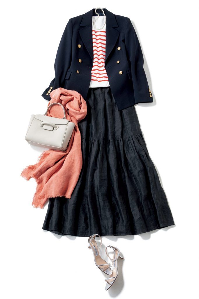ボーダーT着回し 紺ジャケット¥55,000(DES PRÉS)黒ティアードスカート¥31,900(サクラ/インターリブ)バッグ¥52,800(ヴァジック/ヴァジックジャパン)サンダル¥57,200(ネブローニ/デミルクス ビームス 新宿)ストール¥34,100(アソース メレ/アイネックス)ネックレス¥22,050(アビステ)