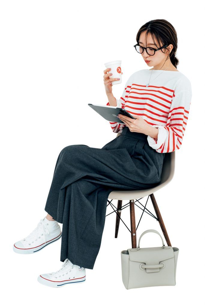 ボーダーT着回し グレーワイドパンツ¥42,900(エイトン/エイトン青山)バッグ¥52,800(ヴァジック/ヴァジックジャパン)スニーカー¥6,380(コンバース/コンバースインフォメーションセンター)めがね[セットレンズ代込み]¥11,100(ゾフ/ゾフ カスタマーサポート)ネックレス¥55,000(マリハ)