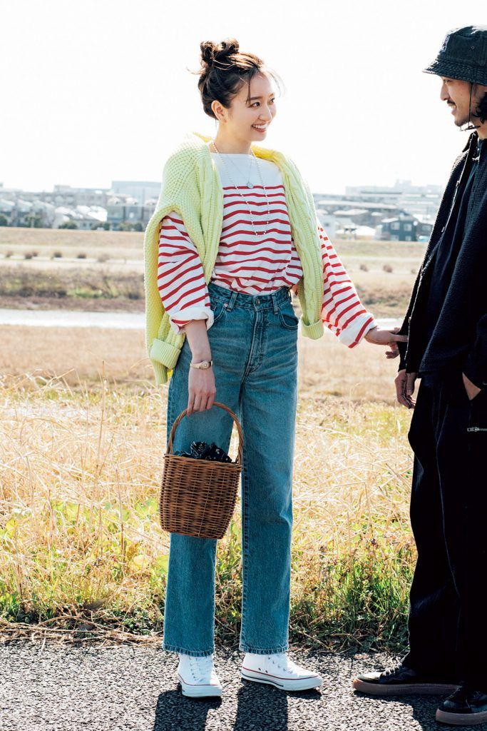 ボーダーT着回し 春色カーディガン¥44,000(スローン)デニム¥14,300(SOMETHING/エドウイン・カスタマーサービス)バッグ¥52,800(ヴァジック/ヴァジックジャパン)ローファー¥27,500(ドクターマーチン/ドクターマーチン・エアウエア ジャパン)イヤリング¥3,150(アビステ)