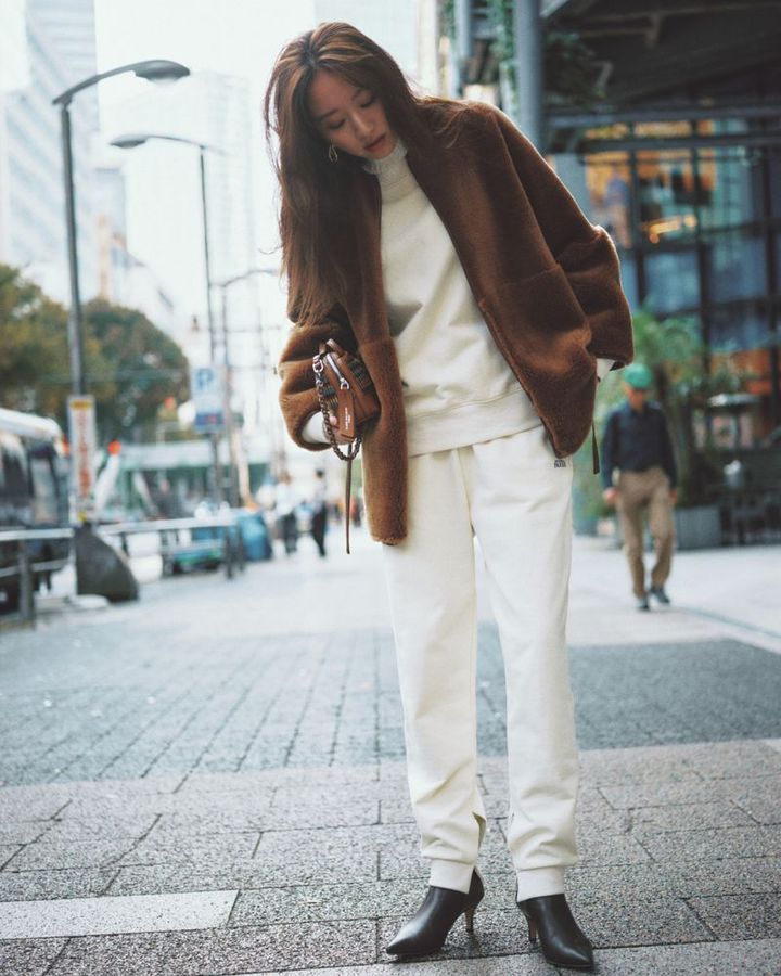 スウェットパンツ¥15,400スウェットトップス¥17,600(ともにエミ/エミニュウマン新宿店)ボアジャケット¥56,100(RHC/RHC ロンハーマン)ニット¥47,300(エッフェ ビームス/ビームスハウス丸の内)バッグ¥33,000バッグに付けたチェーン¥9,900(ともにジャンニキアリーニ/ジャンニキアリーニ 銀座店)ブーツ¥35,200(2,718/ガリャルダガランテ 青山店)