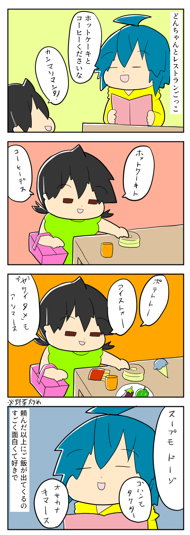 2016年生まれの兄ぽこちゃん、2018年生まれの妹どんちゃんのママであるmochikoさんから、ごっこ遊びのお話です。mochikoさんがお客さん、どんちゃんがレストランの店員さんという設定のレストランごっこ。どんちゃんのレストランはどんなお店なのでしょうか?