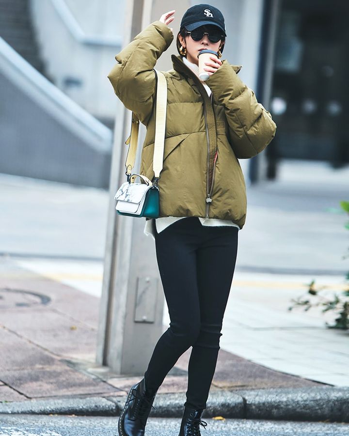 2月11日(土)、ボリューミィで存在感の強い「ダウン」には、コンパクトな黒スキニーを合わせてシルエットにメリハリを。足元はスニーカーよりも、ゴツめの黒ブーツが好バランス。大ぶりのピアスやサングラスでエレガントに盛りつけしつつ、キャップで都会的にハズのが、洗練度アップのコツです。