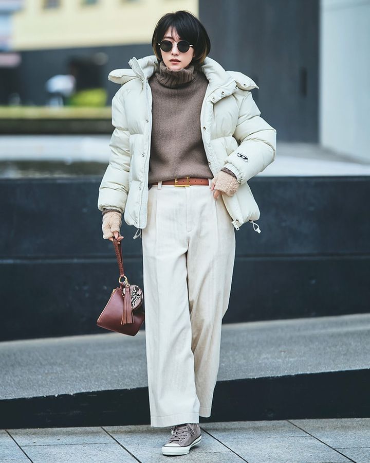 2月15日(水)、まだまだ寒い…そんな日は、やっぱりダウンの出番。一見難易度の高そうな白ダウンですが、カフェラテ配色を意識するだけで、今っぽく大人の着こなしに。アウターとパンツのカラーをリンクさせれば、縦のラインが強調されて、スタイルアップが叶います。足元はスニーカーで、コンサバ見えを回避して。