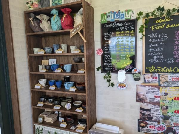 店内では陶器も販売されています。コーヒータイムを楽しむアイテムとしてコーヒーとご一緒に…という奥さまのアイデア。すてきなカップが並んでいました。