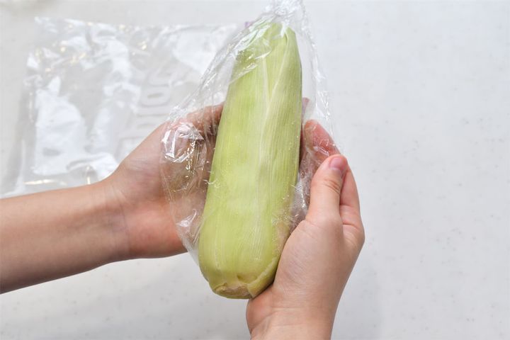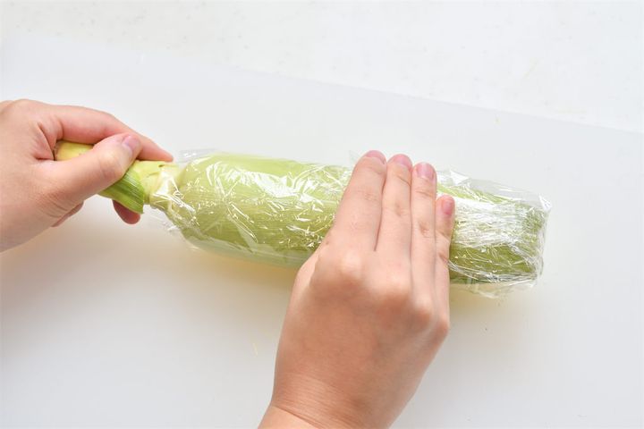 2. とうもろこしをラップで包む。