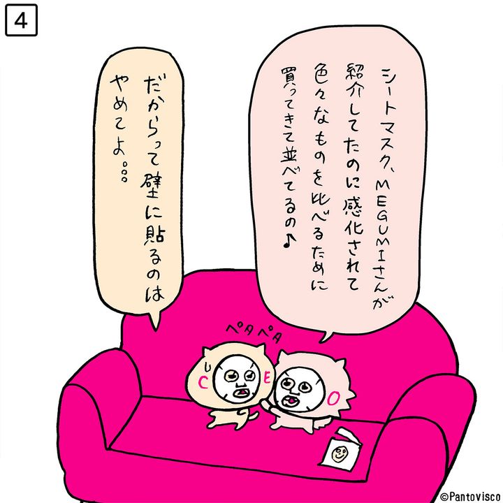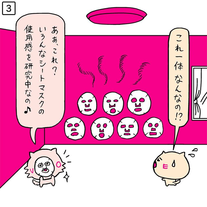 シートマスクを壁に貼り付けて研究中のビヨーニャ。そこにやってきたビギーニャはドン引きですが、実はVOCEではそんなに珍しい光景ではありません。とは言ってももちろん、壁には貼りませんけれど(笑)。コスメをお試しするイベントをよく開催するのですが、イベントではジップロックなどにシートマスクを広げて入れ、袋に残っている液も全て注いで、比較してもらうんです。マスクのどこに切り込みがあるのか、サイズ、厚み、液量などを見比べるんですね。だから、ビヨーニャはやっぱり正しい美容好きさんと言えるかもしれません(笑)。