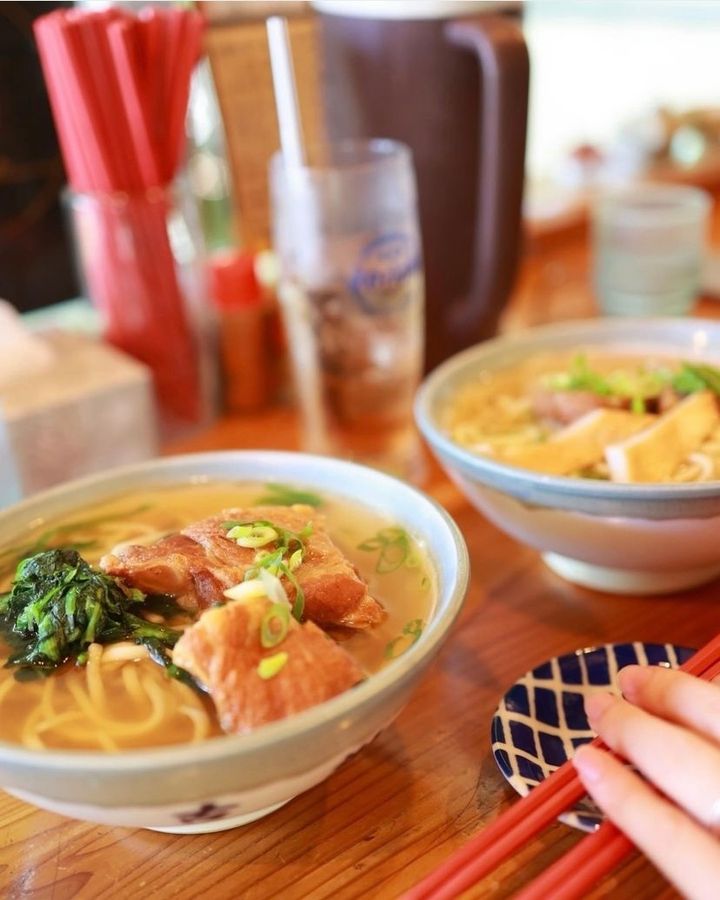 「沖縄そば」には、甘辛く煮込んでスライスされた豚肉がトッピングされています。優しい味わいの透き通ったスープに豚肉から出汁が滲み出て、食べ進めるほどにどんどんコクが増していく感動的な美味しさでした!