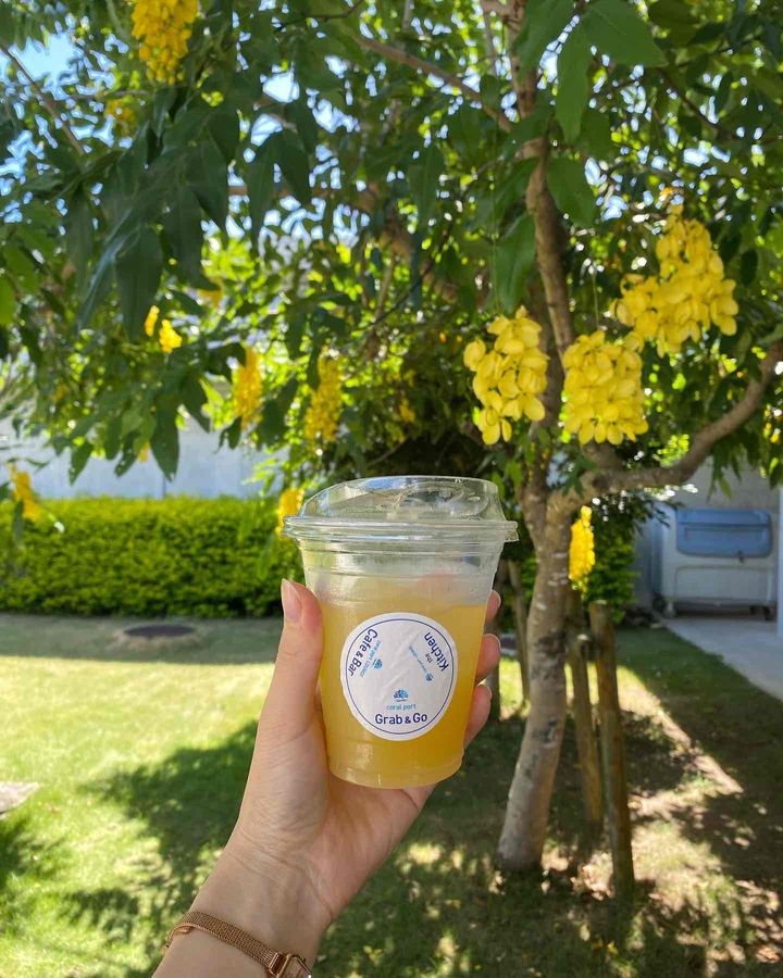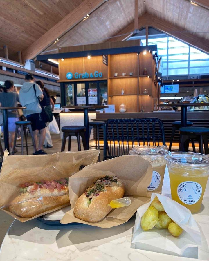 チェックイン棟にあるカフェ「coral port Grab&Go」は、飛行機に乗らない方でも気軽に利用できます。海ぶどうがトッピングされた作りたてのサンドウィッチ、地元産フルーツのスムージーなどがいただけます!