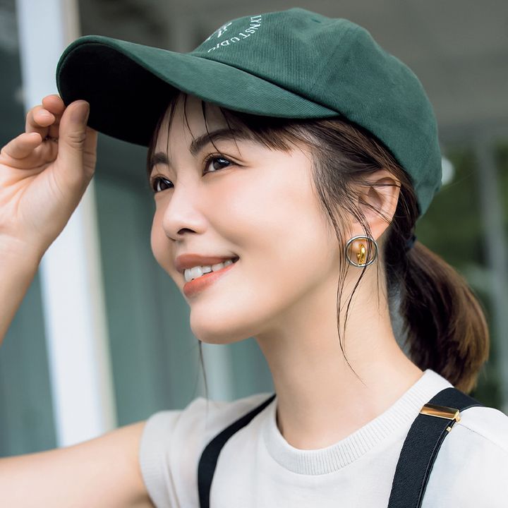 そろそろヘアカラーしなきゃ、というタイミングで活躍するのがキャップ。ざっくり下めにポニーテールを作ってから帽子をかぶり、顔まわりのニュアンスを引き出していくのがカギ。特にこめかみの毛を出すと小顔効果も!