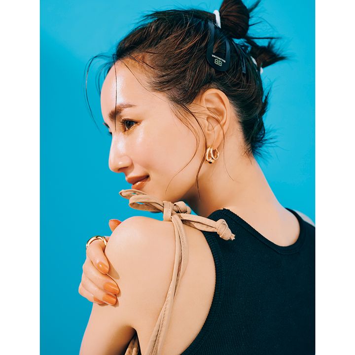 ヘッドバンド¥9,900(イリスフォーセブン/フーブス)キャミソール¥13,200(デミルクス ビームス/デミルクス ビームス 新宿)肩掛けしたカットソー¥15,400〈ルミノア〉(ゲストリスト)ピアス¥53,900〈ローマニン〉(フィルグ ショールーム)