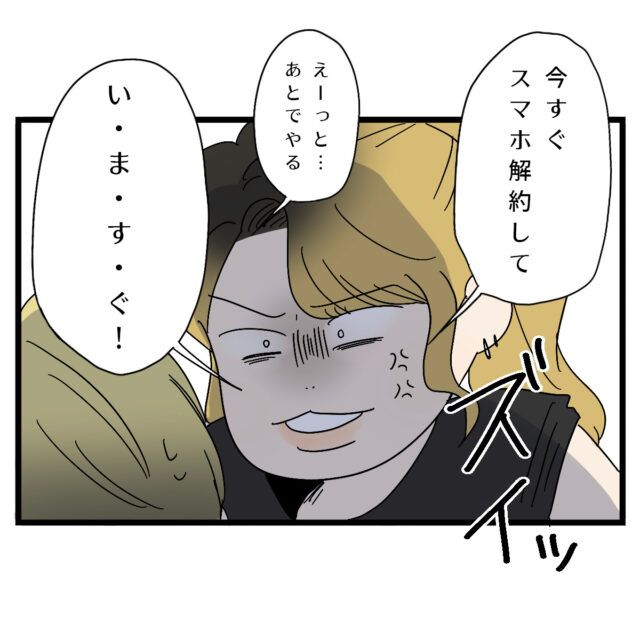 そう言った後、信也さんにさらに近づいたサチさんは「今すぐスマホ解約して」と凄みます。サチさんの勢いに押され「えーっと・・あとでやる」と言う信也さんに、間髪入れず「い・ま・す・ぐ!」と圧をかけるサチさん、絶対逃がさないとばかりに信也さんに詰め寄りました。