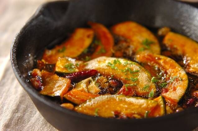 ホクホクのカボチャとミックスビーンズで作る簡単アヒージョ。ミックスビーンズを使っていますが、豆はお好みのものでも大丈夫! スキレットを使うと、そのまま食卓に出せて簡単ですよ。