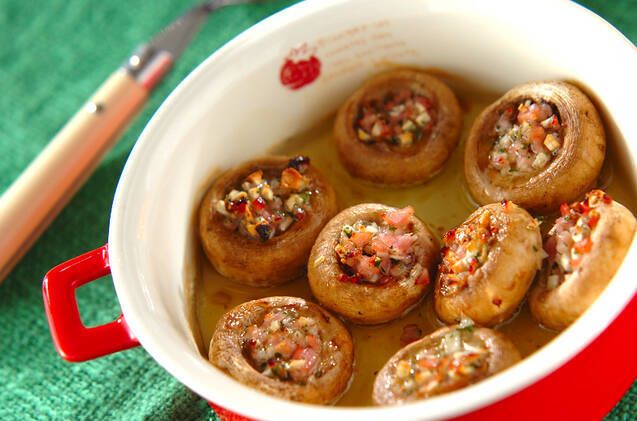 マッシュルームにみじん切りにしたベーコン、ニンニク、ドライパセリ、アンチョビペーストを混ぜ合わせたものを乗せ、オリーブオイルをかけて200℃に予熱したオーブンで15分焼いて完成。マッシュルームの旨みとベーコンの塩気がたまらない一皿です。