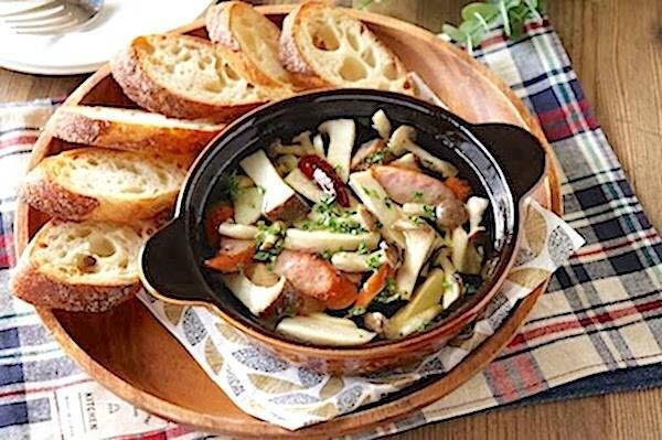 オーブントースターで簡単に作れるキノコたっぷりのアヒージョは、ソーセージ入りでボリューミー。ワインやビールのおつまみにピッタリですよ。
