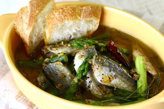小アジを丸ごと食べられる栄養価も抜群なアヒージョです。小アジのゼイゴが気にならない場合はそのままでもOKです。熱々を食べてくださいね。オイルが残ったらパスタにすると絶品です。