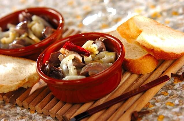 肉類の中でカロリーが低く、コリコリした食感が楽しい「砂肝」に、同じく食感が楽しめるレンコンを合わせてアヒージョに。少ない油で作れます。ワインのお供にどうぞ。
