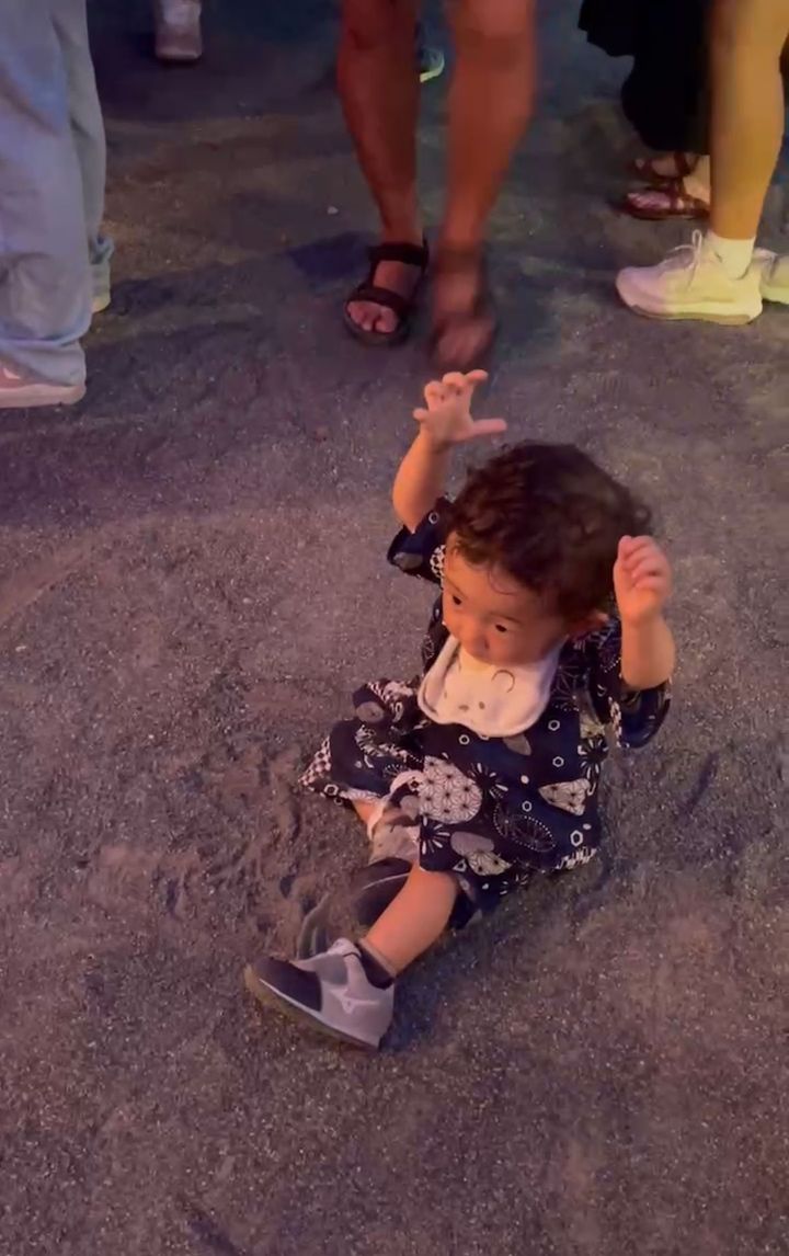 人の往来が多い地べたに座って砂を何度もすくって感触を楽しんだり、おぼつかないあんよで屋台をのぞき込んだり…。肝心な屋台でのご飯も全く食べず…!おなかが空くという事より、1歳初めてのお祭り(去年連れて行った時は終始抱っこされて終わったので)が楽しくて仕方がないようです。これはパパも予想外…!持ってきた飲み物はなんとか飲んでいたようです。