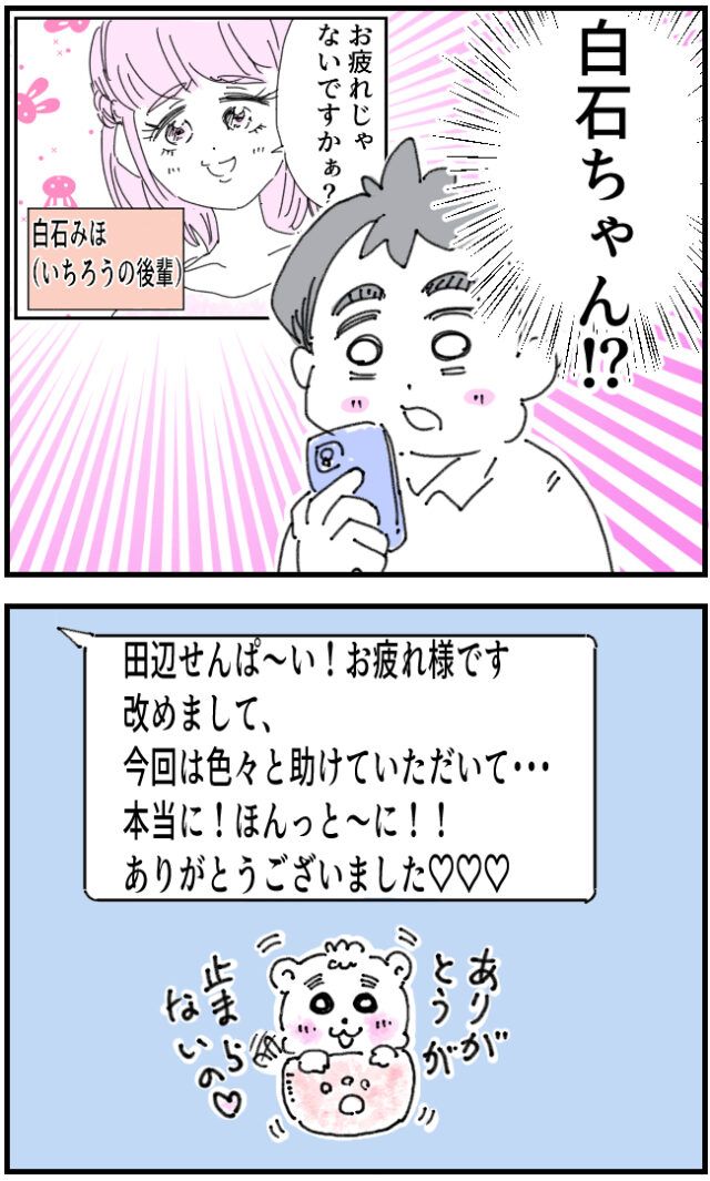すると「お疲れじゃないですかぁ?」会社の後輩白石さんからメールが!「白石ちゃん!?」いちろうさんが不思議に思ってメールを見てみると、「田辺せんぱ~い!お疲れさまです。あらためまして、今回はいろいろと助けていただきて・・本当に!ほんっと~に!!ありがとうございました(ハート×3」と、スタンプ付きでメッセージが届きました。