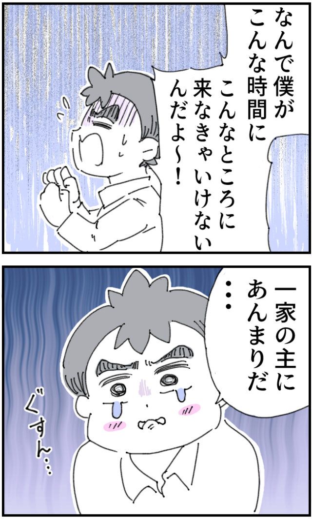 「なんで僕がこんな時間に、こんなところに来なきゃいけないんだよ~!一家の主にあんまりだ・・」いちろうさんは目に涙をためてくやしがりました。
