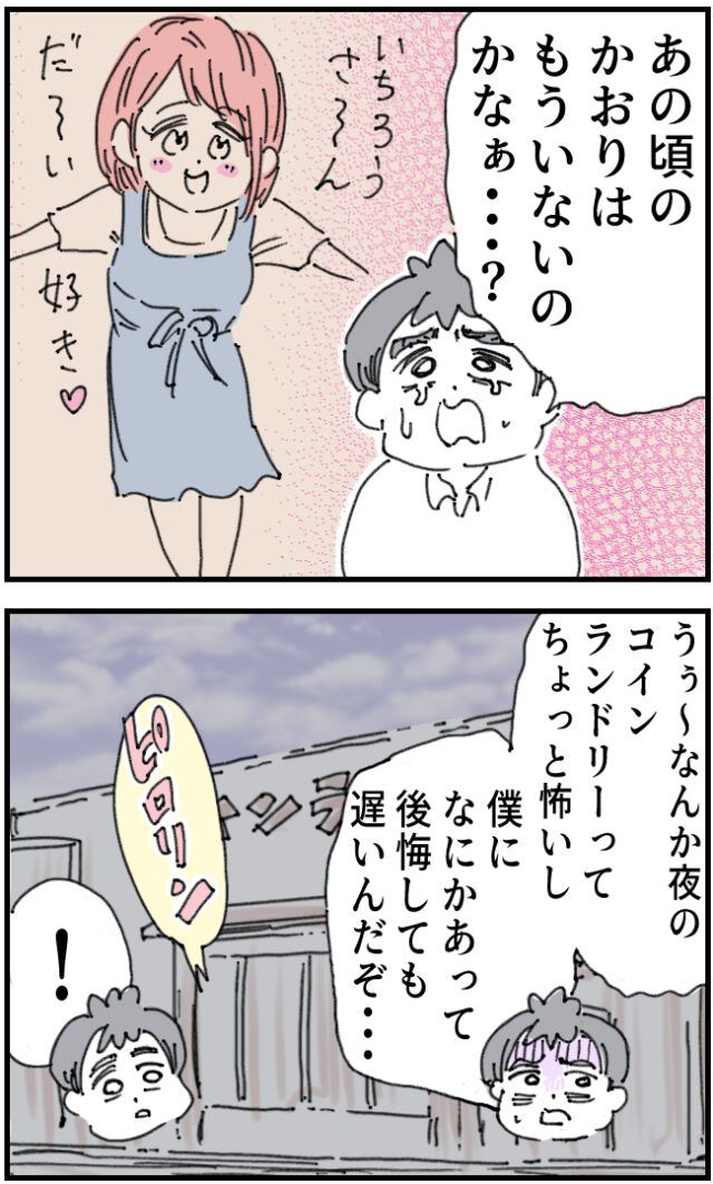「あの頃のかおりはもういないのかなぁ・・?」と結婚当時のかおりさんのことを思いを馳せながら、「うぅ~なんか夜のコインランドリーってちょっと怖いし・・僕に何かあって後悔しても遅いんだぞ・・」と呟いていたところ、いちろうさんのスマホが「ピロリン」鳴りました。
