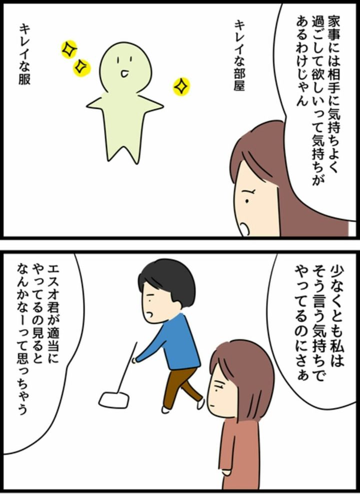 当初は「相手にしてあげたい」という一心で家事をしていたエムコちゃんですが、自分がやって当たり前になっていたことにモヤモヤしたのですね。いつのまにかエスオくんのお母さんのようになっていることが良くないと思っていたようです。