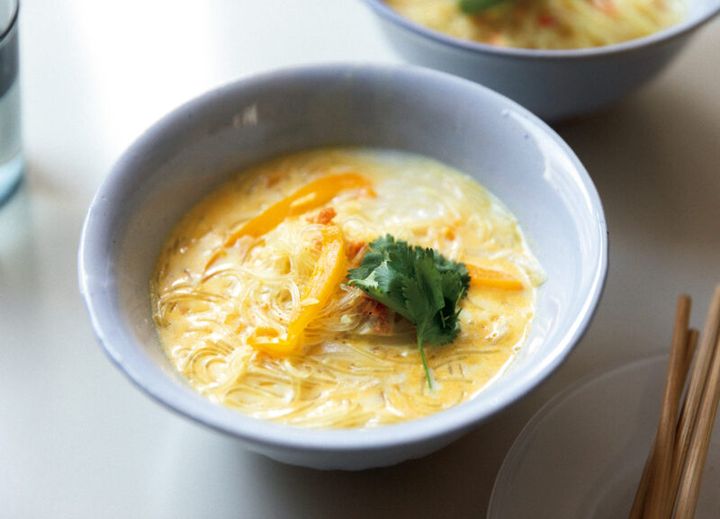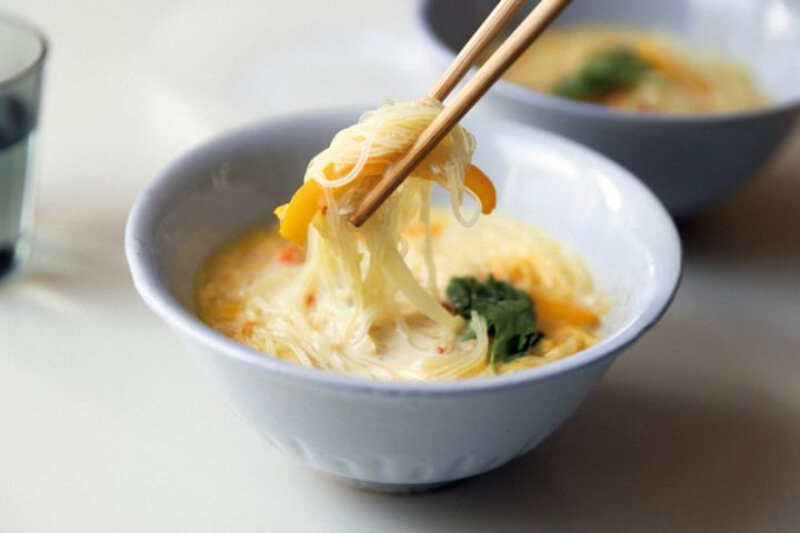 2. 1に春雨を入れ、弱めの中火で混ぜながら3〜4分煮る。牛乳を加え、砂糖と塩で味を調えたら、さらに1分煮る。最後に酢を加え、すぐに火を止める。器に盛り、お好みで香菜を散らす。