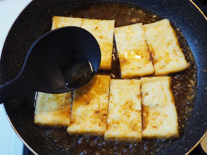 火を止めると、あげにす〜っとだしが吸い込まれていきます。ちなみに、素麺などに合わせず揚げだけ食べる場合はだしが2/3程度まで炊けば濃すぎることなくおいしくいただけるそう。