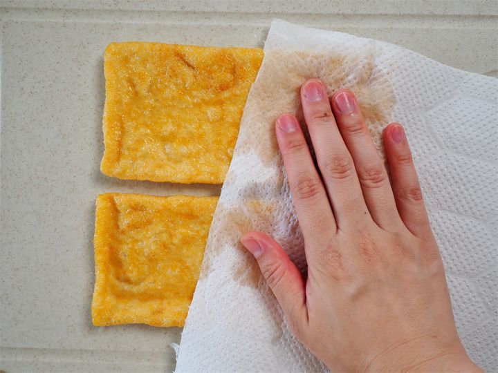 1. 油揚げにさっと湯をかけ、キッチンペーパーで水気を拭き取り、油抜きをする。