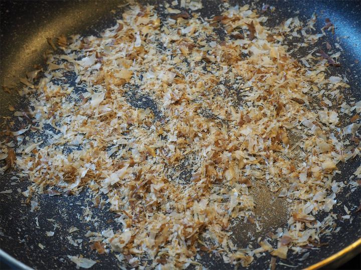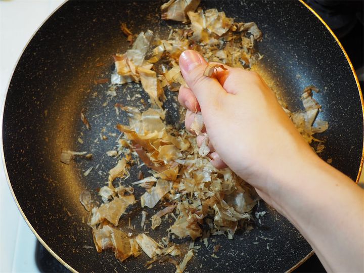 3. フライパンを火にかけ温まったら火を止め、かつお節を入れ炒る。水分が飛んだら指を擦り合わせたり握ったりして潰し、粉状にしていく。