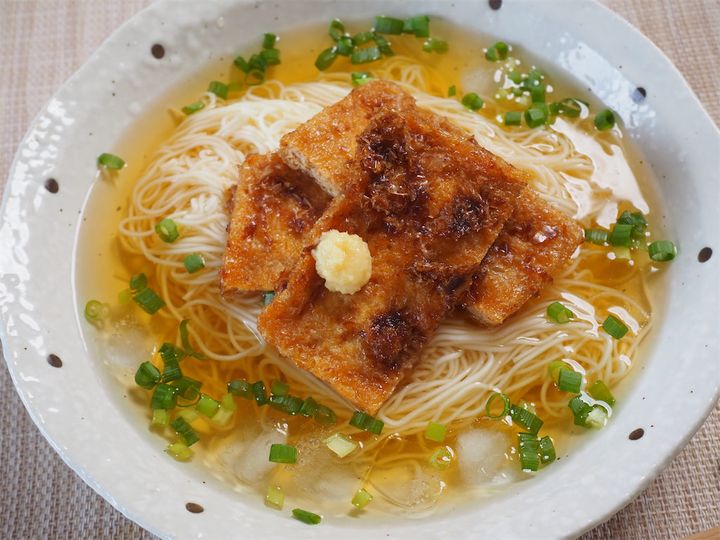 夏の風物詩であり、ランチの登場回数が最も多い食べ物と言えば素麺(ですよね?)。常に新しい素麺レシピを探している筆者が、最近とっても気になったのがこの「冷やしきつね素麺」です。麺の上に鎮座する「お揚げ」はもちろん市販品であろうはずがなく、きっちり炊き上げます。なので、だしの旨味が圧倒的で、お店で出てくるような本格的な仕上がりとか。また市販のめんつゆも使わず、酢じょうゆでさっぱりといただきます♪シンプルながらこだわりの詰まった一杯。さっそく作ってみよう!