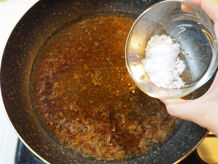 5. 砂糖が溶けたら2を入れ、だしが半分くらいになるまで炊いていく。炊き終わったら火を止める。