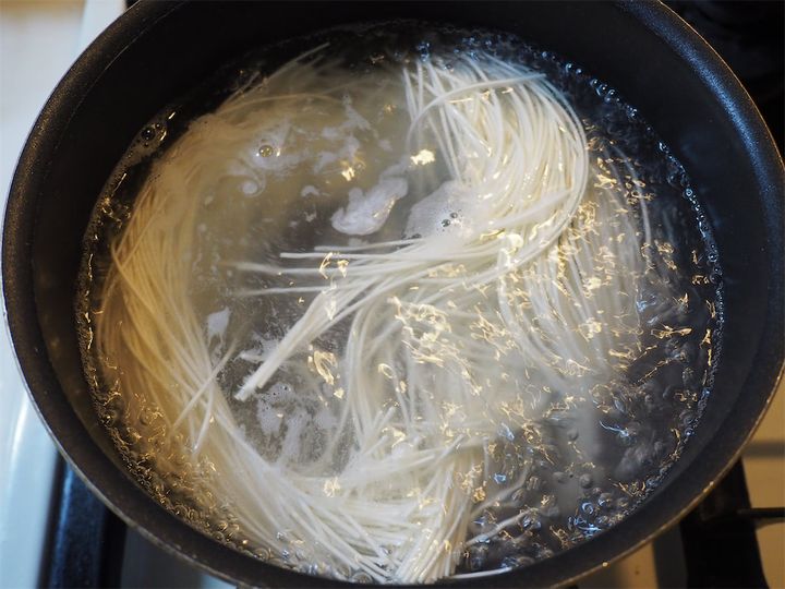 8. たっぷりの水(分量外)を鍋に入れ沸かしたら、素麺を茹でてお湯を切る。