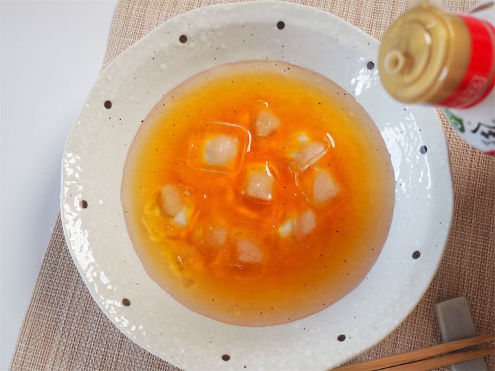 7. お皿につゆ用の材料の水、氷、しょうゆ、酢を入れ混ぜ合わせる。