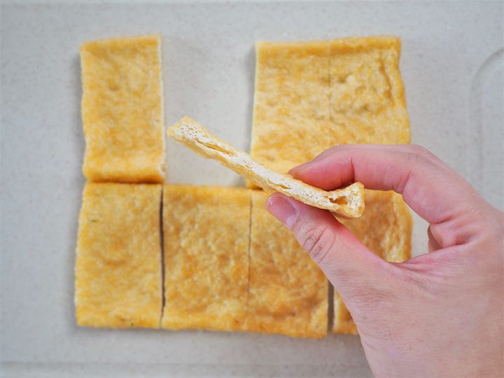 ※油揚げは中が空洞では無いものがベスト。地域によって呼び方が違うから説明が難しいとのことですが、“薄揚げ“と呼ばれているものを使うといいそう。スーパーでなるべくぺたんこの油揚げを探してみてください♪