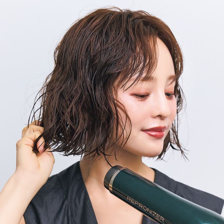 「梅雨に最適、クセを生かしたパーマ風ヘア。クセは出ても広がらないように全体にフォーム、毛先にクリームをつけるのがコツです。」