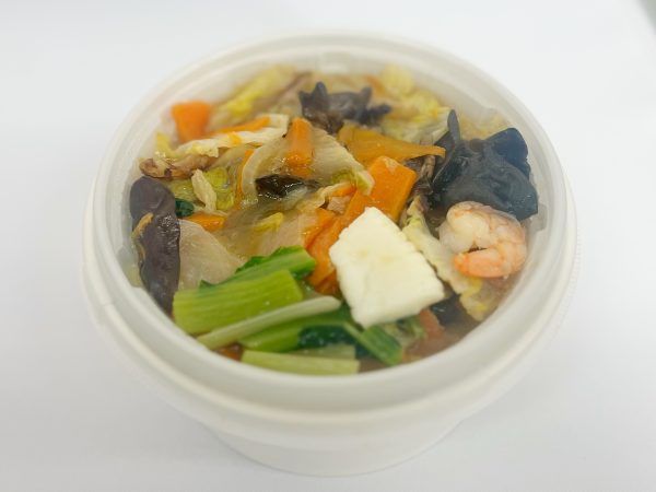 魚介の旨みもたっぷりの中華丼には、にんじん・キクラゲ・小松菜など彩りも意識した野菜をたっぷり入れました(572円)。新たに開発したセブン-イレブンのオリジナル中華スープも味のポイントです。