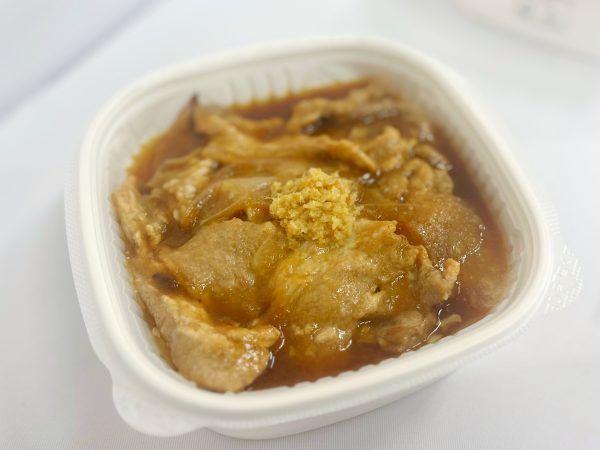 脂身と赤身のバランスの取れたバラ肉を加熱蒸気オーブンでじっくり火を入れているので、お肉がとっても柔らかい♪香りのよい国産生姜と、おろしりんごでちょっと甘めの味つけです。