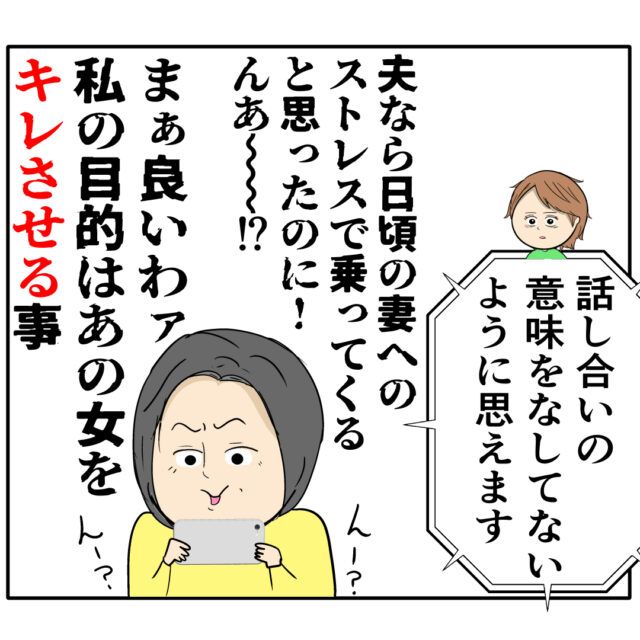 「話し合いの意味をなしてないように思えます」すみれさんの冷静な正論に対して「夫なら日頃の妻へのストレスで乗ってくると思ったのに!んあ~~!?まぁ良いわァ。私の目的はあの女をキレさせる事」とやば美さんは心の中で呟きます。